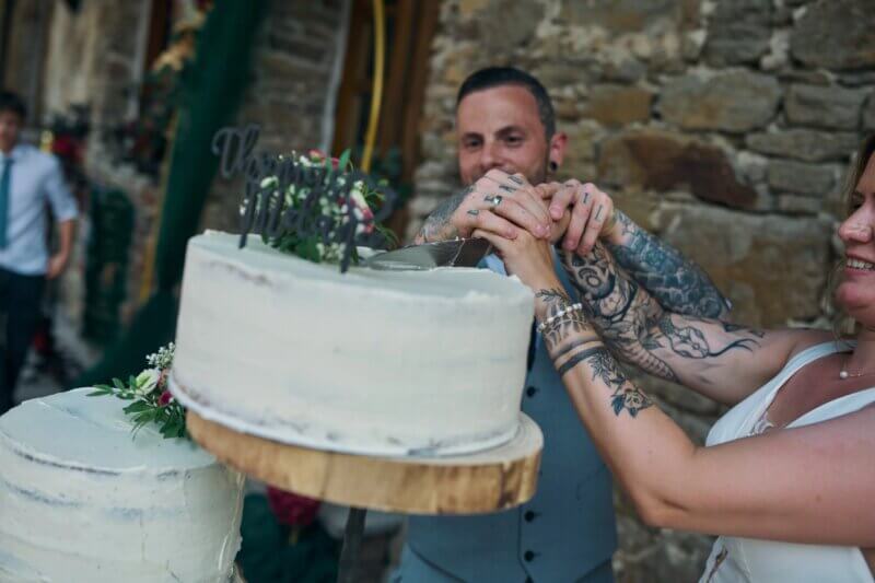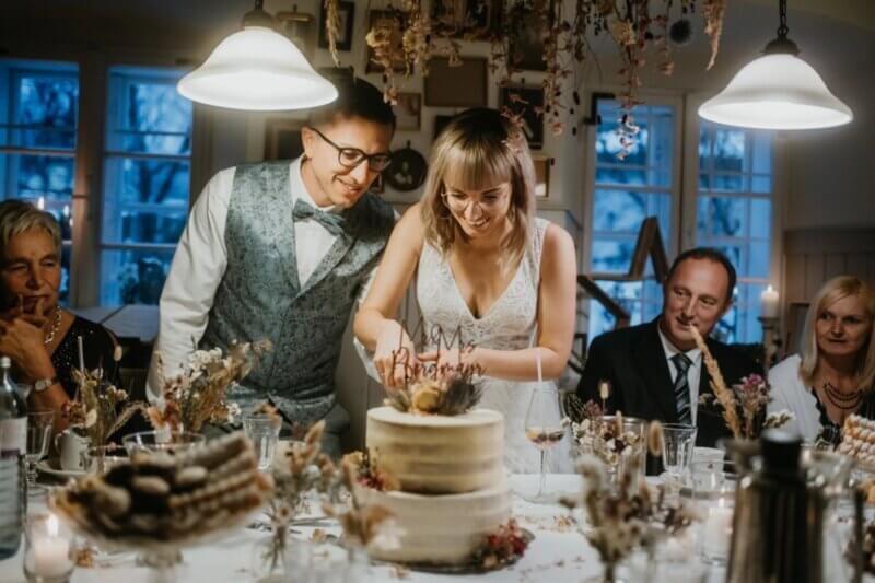 Ihr werdet eure Hochzeitstorte selbst anschneiden, aber keine Sorge: Niemand erwartet, dass ihr jedem Gast eigenhändig ein Stück serviert. Sprecht am besten mit eurem Catering-Team oder dem Konditor, wie die Torte geschnitten werden soll. In vielen Gasthäusern oder Hotels ist das Servieren der Hochzeitstorte bereits Teil des Menüpreises, während Konditoren Anlieferung & Anschnitt oft extra verrechnen.
