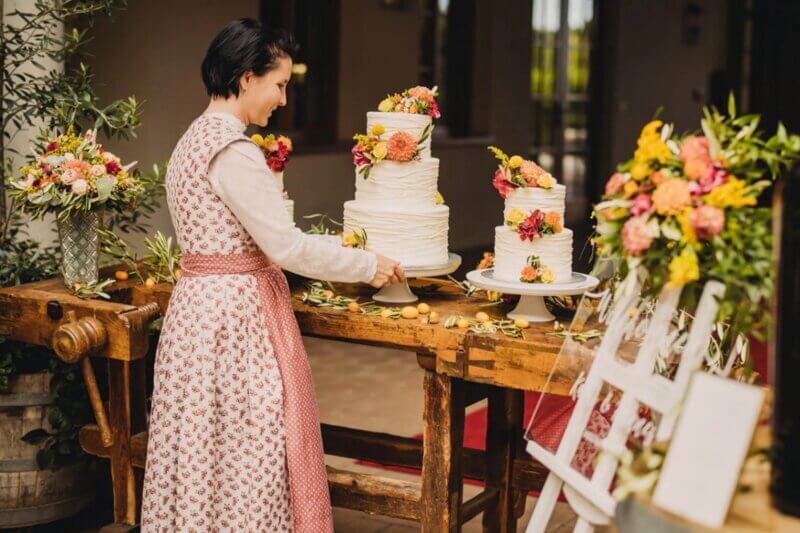 Viele österreichische Paare entscheiden sich dazu, ihre Torte mit echten Blumen vom Floristen zu dekorieren. Das spart ordentlich Budget und passt zudem oft perfekt zum Brautstrauß oder zur Tischdeko. Auch Kunstblumen sind beliebt, weil sie wiederverwendbar sind und optisch kaum einen Unterschied machen.