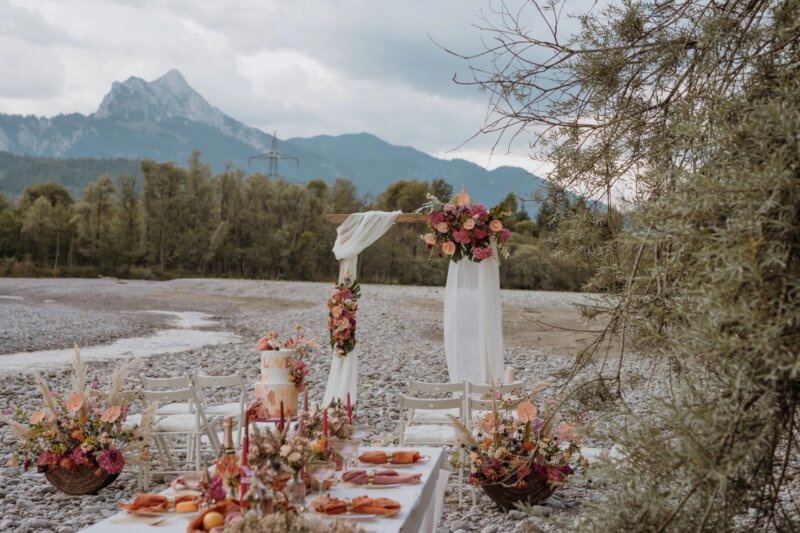 Vereinbart einen Termin für Probearrangements und besichtigt die Location gemeinsam mit eurem Floristen. Besonders bei Hochzeiten in den Bergen oder am See ist es wichtig, die Arrangements so zu planen, dass sie auch wetterbedingt (z. B. bei Wind oder Hitze) gut halten.