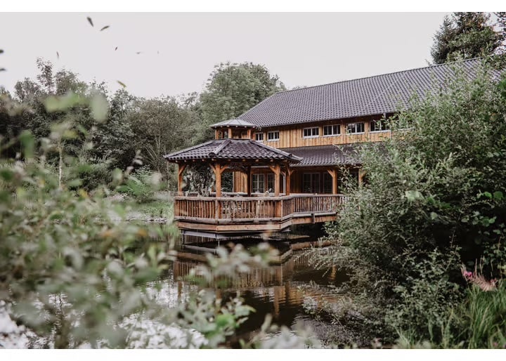 Ein echtes Highlight ist übrigens der Seepavillon für freie Trauungen direkt über dem Wasser. Dazu gibt es eine große Außenterrasse mit Blick ins Grüne und eine Empore mit Lounge-Bereich.