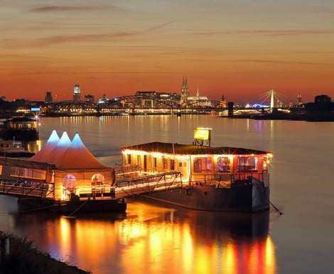 Die Wasserlocation bietet einzigartiges Ambiente mit schönem Blick auf die Skyline von Köln.