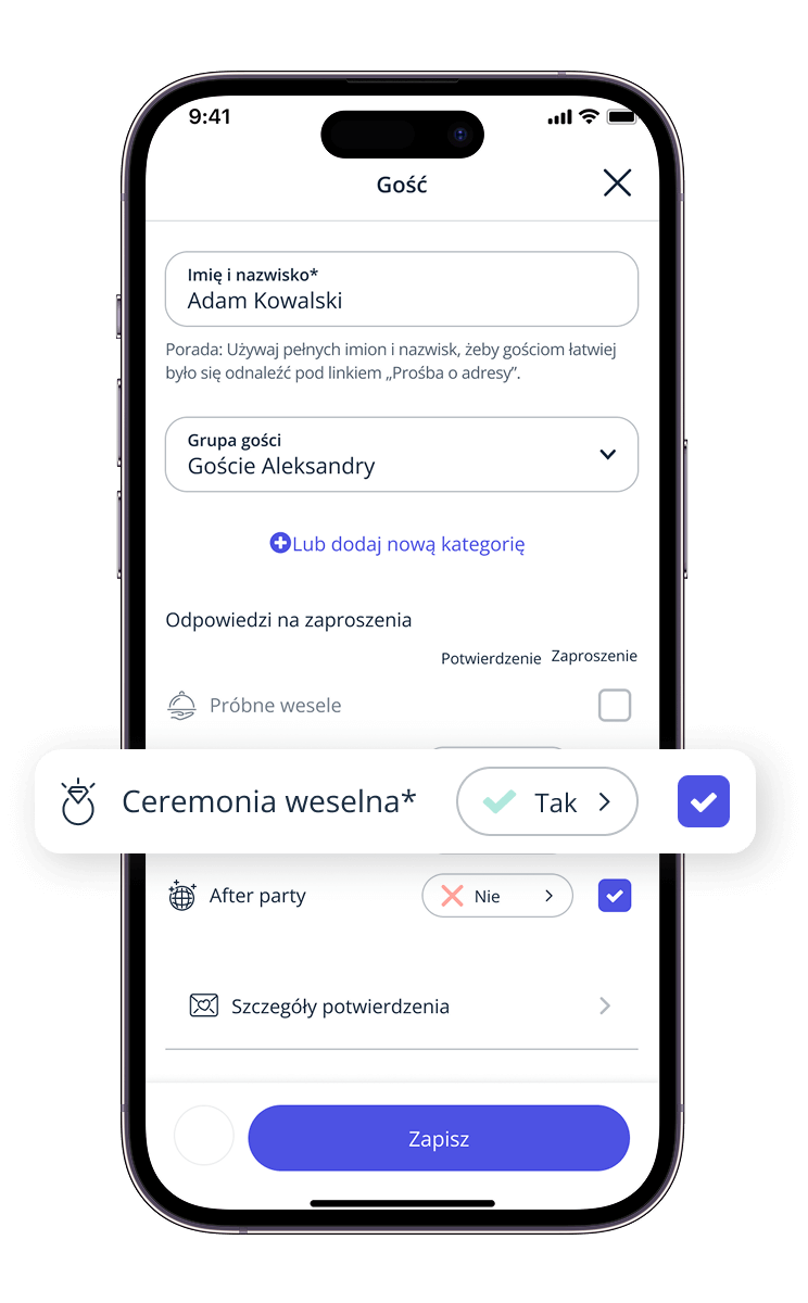 Z łatwością planuj weselne wydarzenia, przypisuj do nich gości i przekazuj im wszelkie szczegóły. Od przyjęcia zaręczynowego po samo wesele, każde wydarzenie dodasz w kilka sekund.