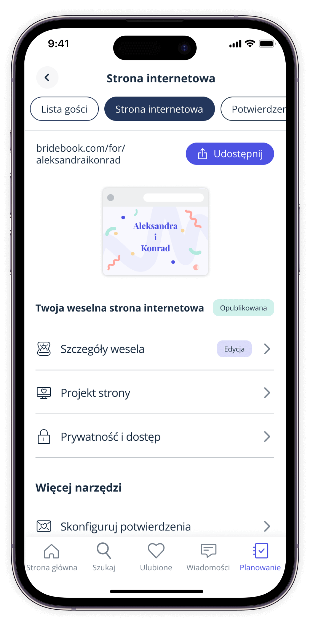 Nie – Wasza strona ślubna domyślnie jest prywatna. Dostęp do strony można uzyskać wyłącznie za pomocą unikalnego linku, a dla dodatkowej ochrony prywatności można ustawić opcjonalne, sześciocyfrowe hasło. Dzięki temu tylko osoby, którym udostępnicie link i hasło, będą mogły ją przeglądać.